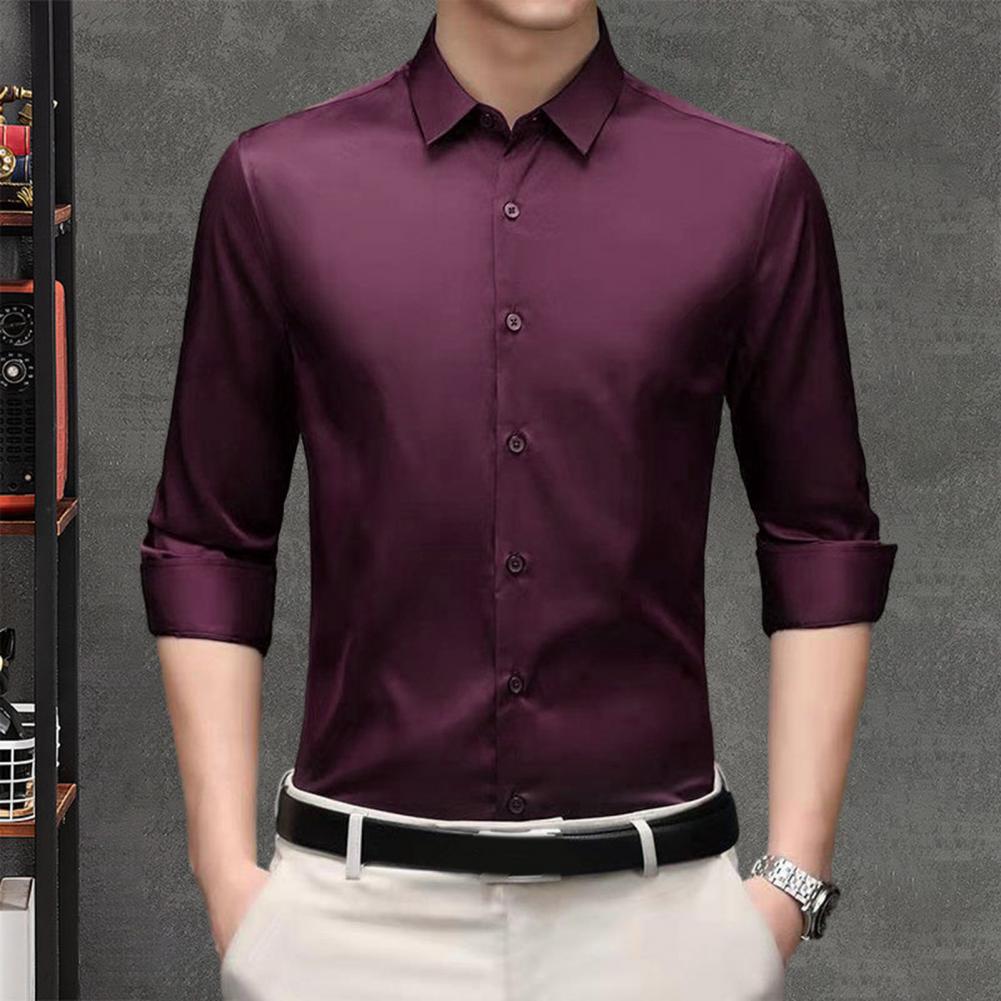 Мужская осенняя рубашка, официальная деловая рубашка, сплошной цвет, против морщин, с лацканами, однобортный, с длинными рукавами, приталенный, шелковистый, дышащий, мужской топ