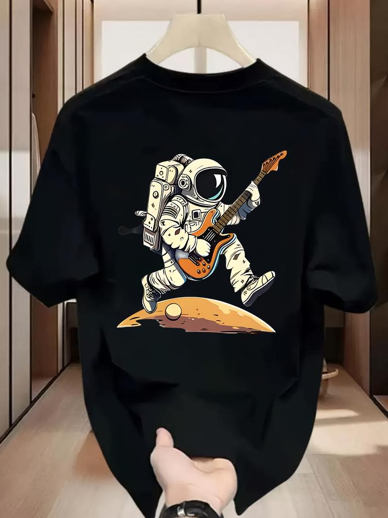 Men Cotton Graphic T-Shirt Astronaut Playing Guitar on Moon Print Casual Round Neck Short Sleeve Summer Tee Men Clothing — купить товар онлайн с бесплатной доставкой по всему миру!