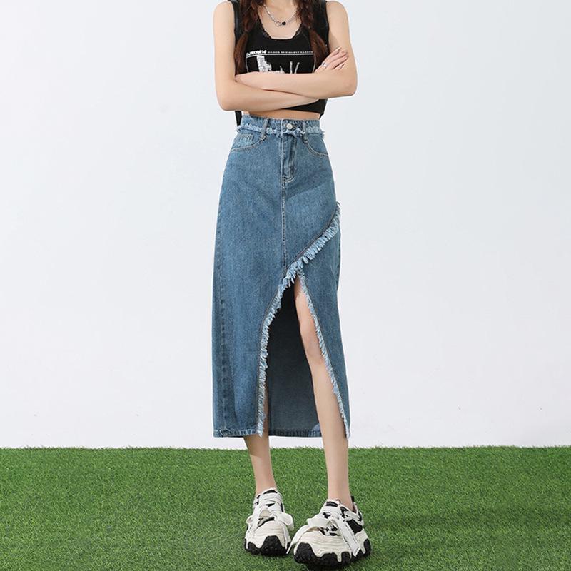 Персонализированная джинсовая юбка с разрезом и неровным краем, новая, с высокой посадкой, средней длины, универсальная джинсовая юбка