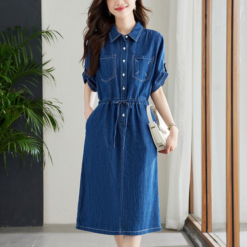 Джинсовое платье женское с коротким рукавом летнее новое темпераментное офисное дизайнерское с кулиской на талии юбка