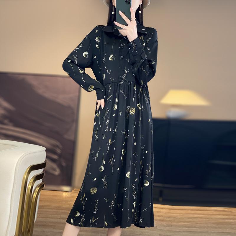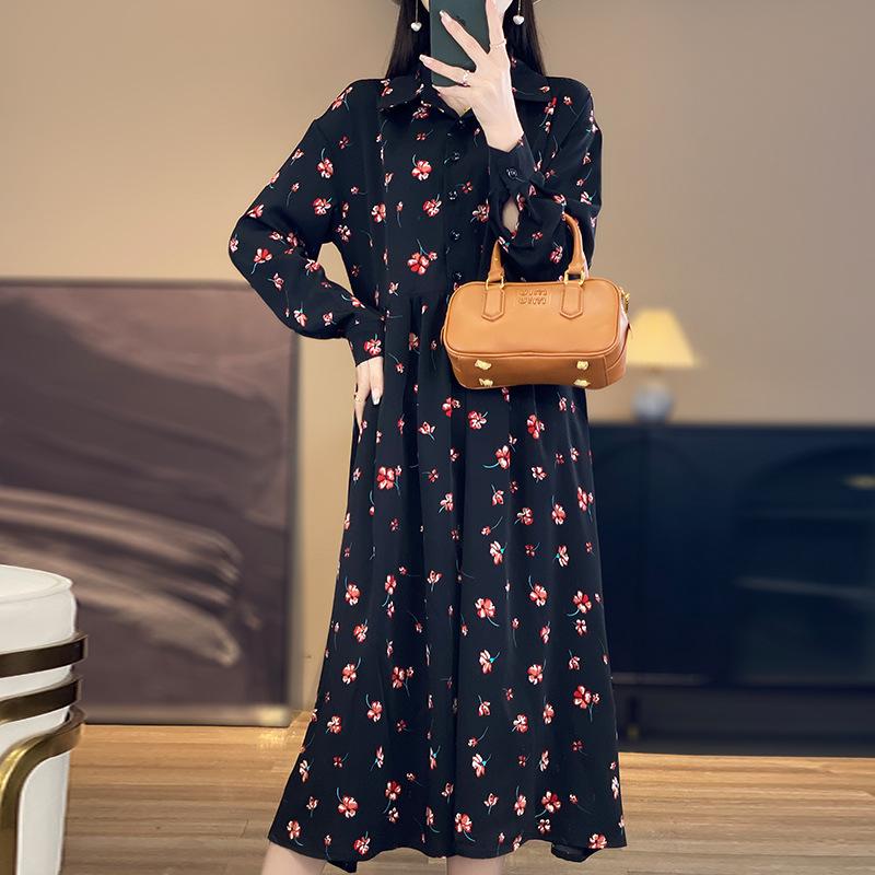 Платье средней длины с цветочным принтом, женское, весна-лето, новое, с воротником поло, длинными рукавами, темпераментное, французского темперамента, длинное