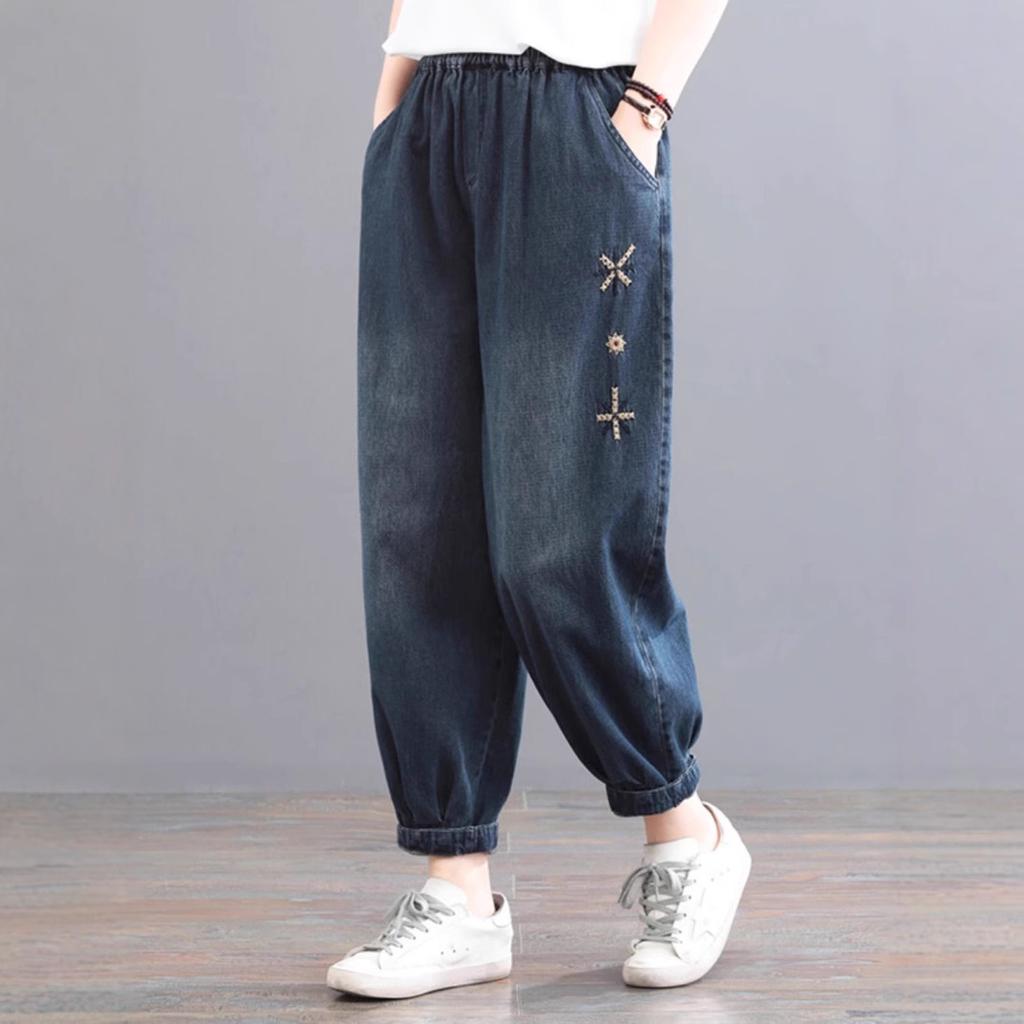 Женские весенне-летние свободные брюки-фонари из выцветшего денима с манжетами, больших размеров, с эластичной талией, повседневные — купить товар онлайн с бесплатной доставкой до всему миру!