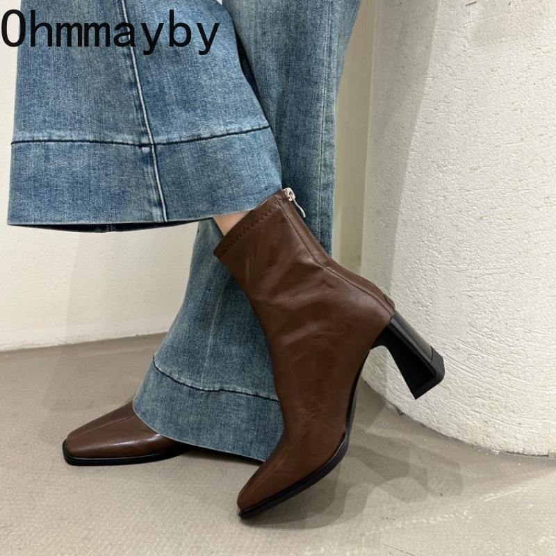 Винтажные женские ботильоны с квадратным носком и толстым каблуком, модные женские эластичные облегающие короткие ботильоны с квадратным носком, осенне-зимняя женская обувь