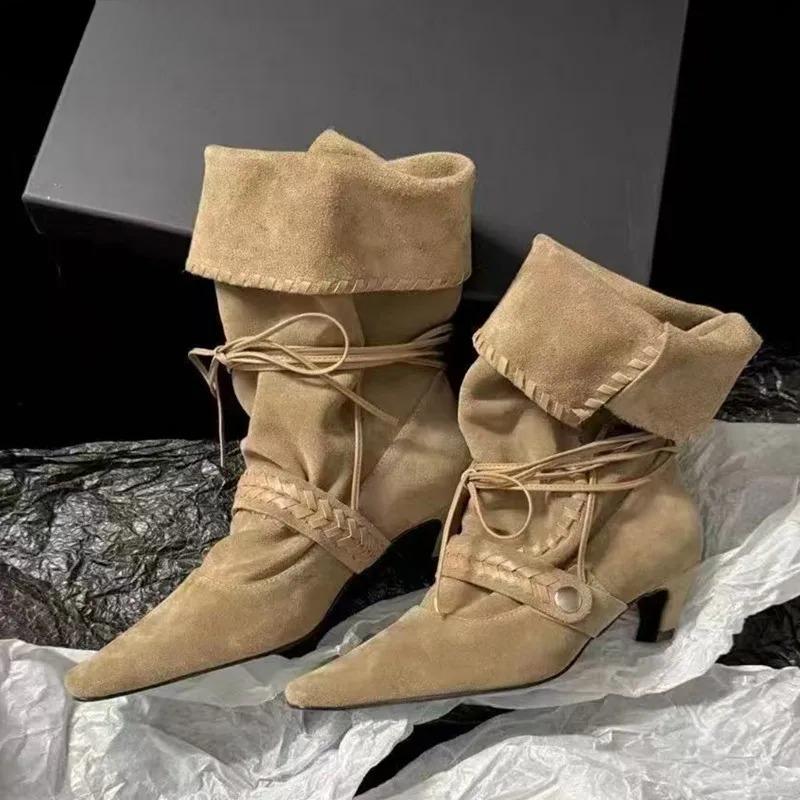 Осень Зима Искусственная Замша Плетение На шнуровке Женские Мотоботы Мода Высокий Каблук Челси Вестерн До середины икры Короткие Ботильоны Обувь