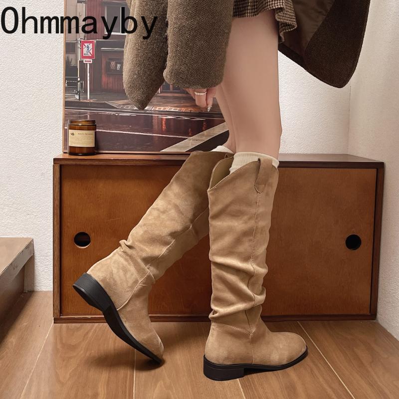 Осень Зима Винтаж Стрейч Слим Женские Сапоги до Колена Обувь Мода Низкий Каблук Обувь Женские Плиссированные Современные Длинные Боты