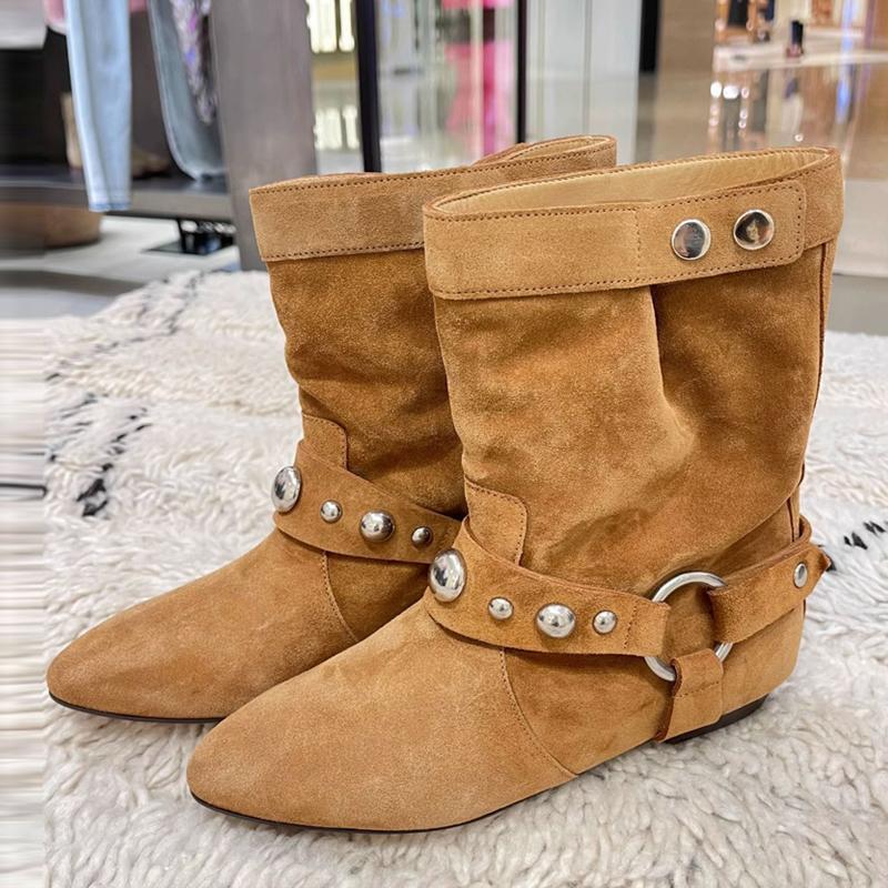 Осенне-зимние женские коричневые ковбойские сапоги, модные, с металлическим ремнем, заклепками и пряжкой, повседневные, на плоской подошве, ботильоны Де Мухер — купить товар онлайн с бесплатной доставкой по всему миру!