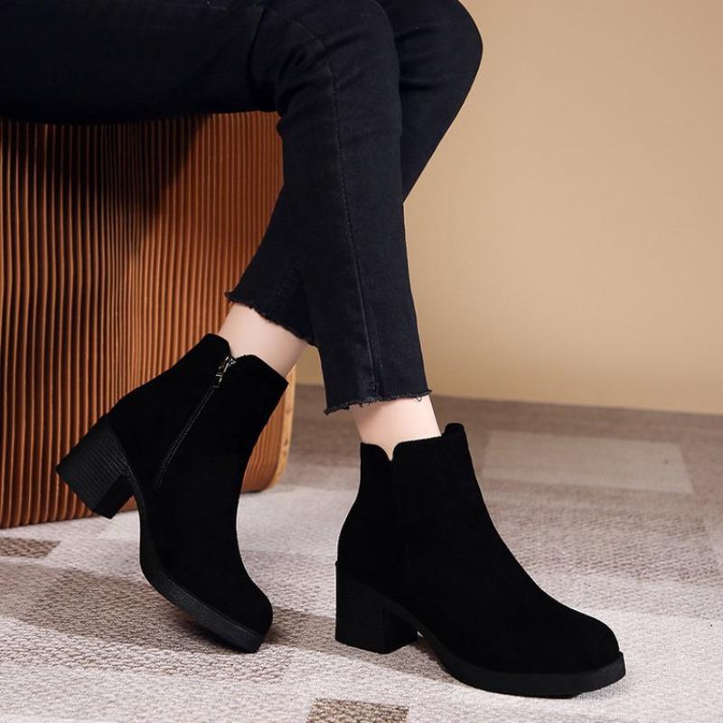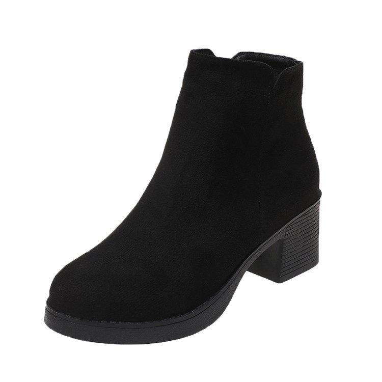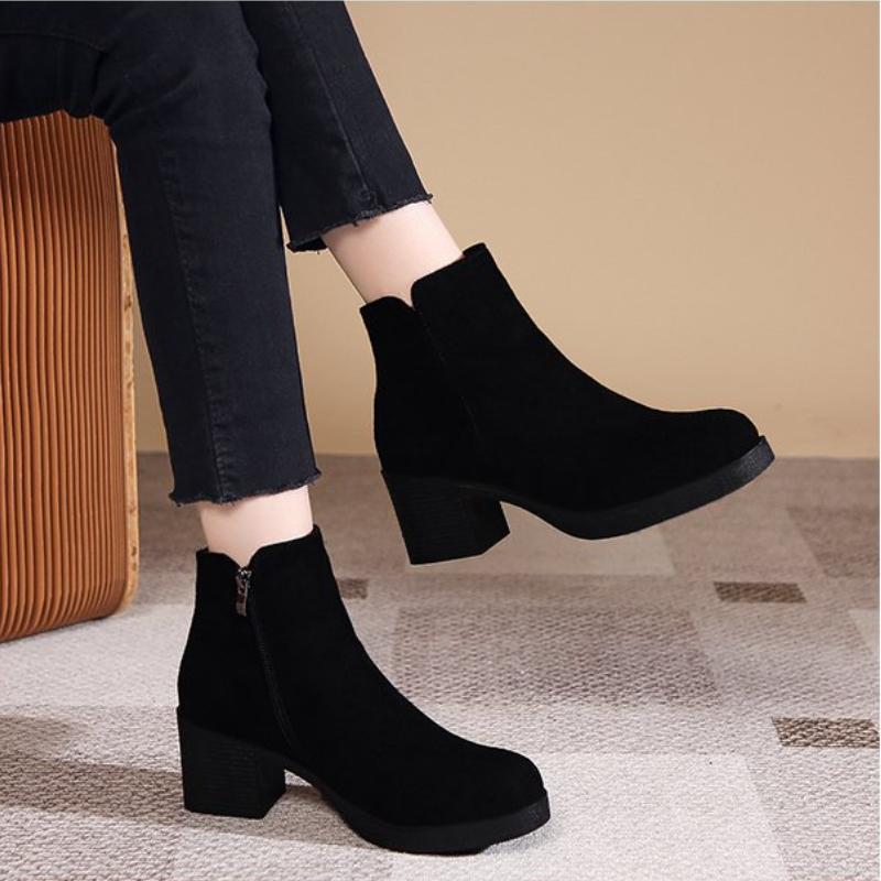 Замшевые Короткие Ботинки Новый Стиль Толстый Каблук Круглый Носок Британский Стиль Матовая Кожа Черный Средний Каблук Пинать Голые Ботинки Платформа