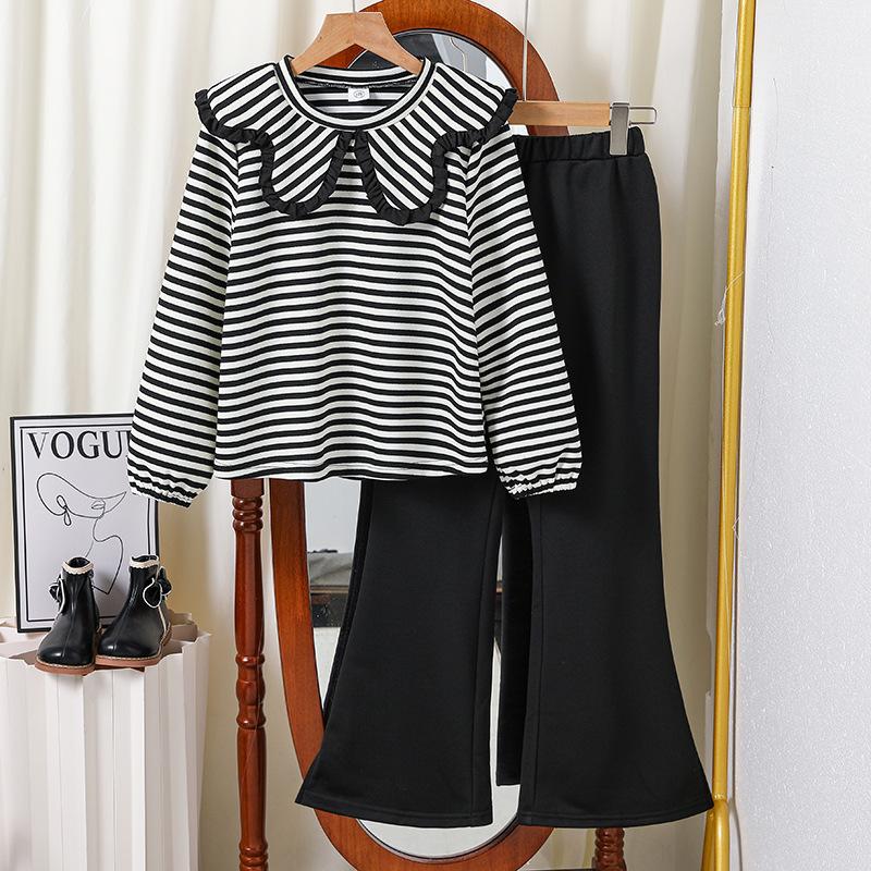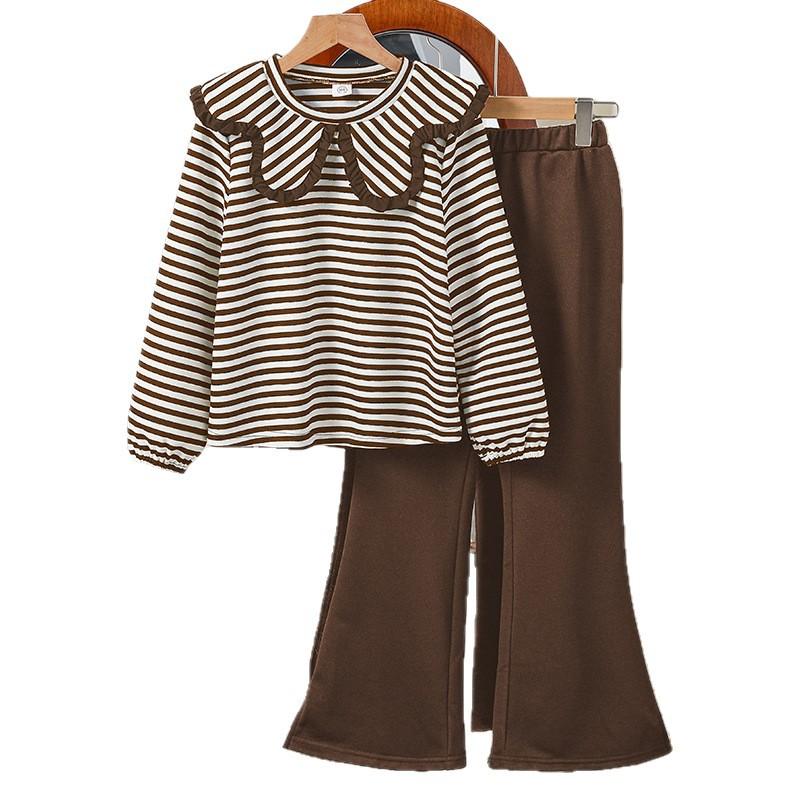Наряд для девочек в корейском стиле, детская одежда, осень-зима, новинка, детский свитшот в полоску с отложным воротником и длинным рукавом, расклешенные брюки, костюм-двойка