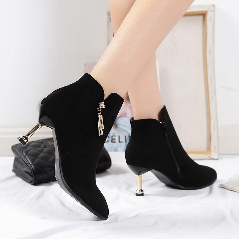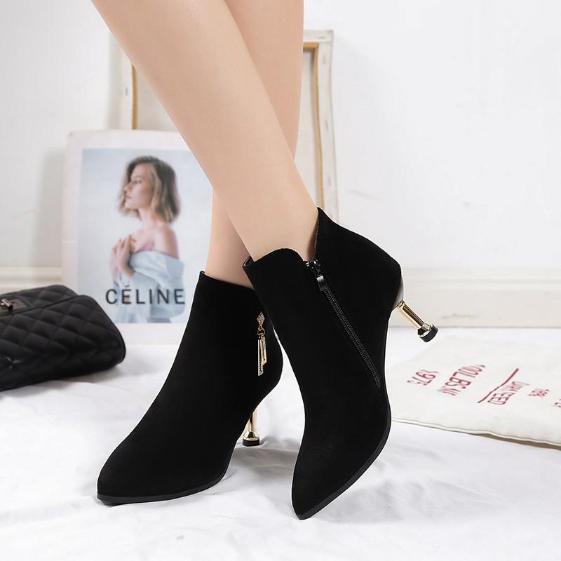 Женские модные тонкие одинарные ботинки на тонком каблуке, зимние, новые, с заостренной боковой молнией, металлической пряжкой, противоскользящие, износостойкие короткие ботинки