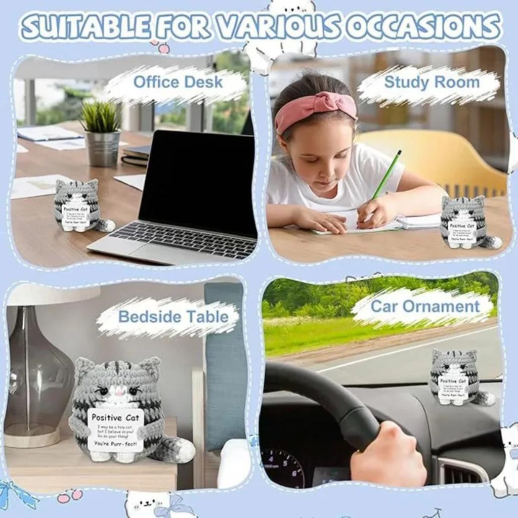 Handmade Crochet Cat Doll Cute Knitted Plush Ornament with Greeting Card Home Decor Gift for Kids Desk Decoration Fairy Garden
