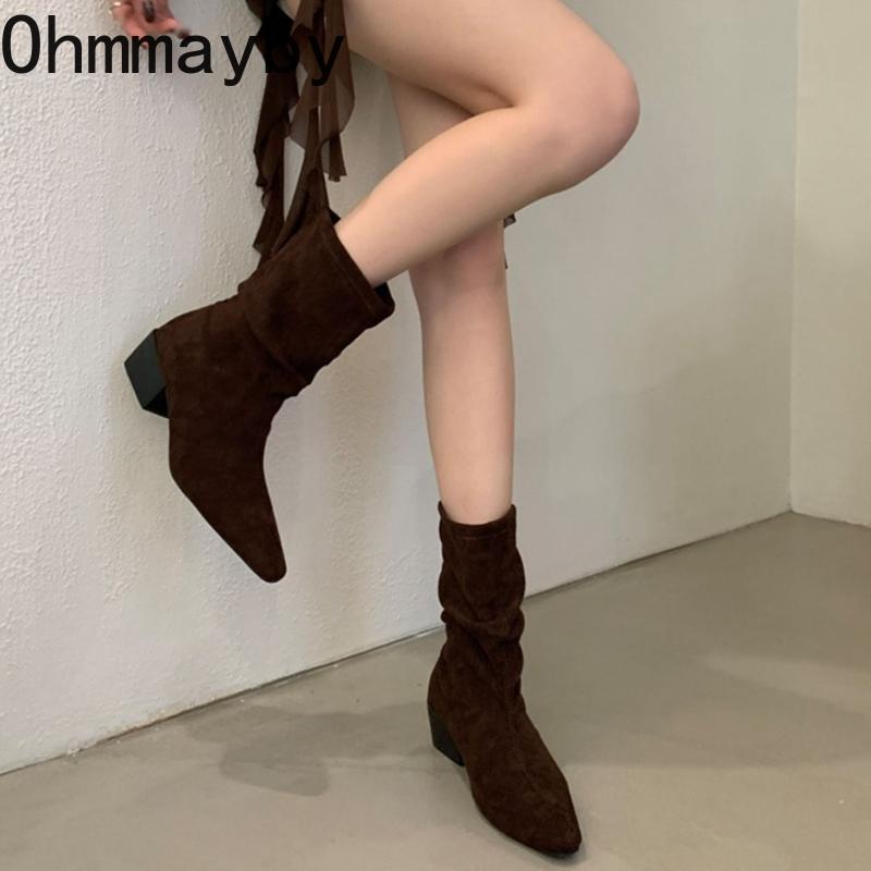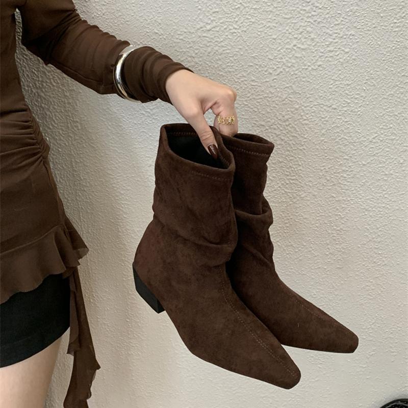 Винтажные плиссированные женские ботильоны до щиколотки Осень Зима Острый носок Узкие короткие ботильоны Модная обувь на квадратном каблуке