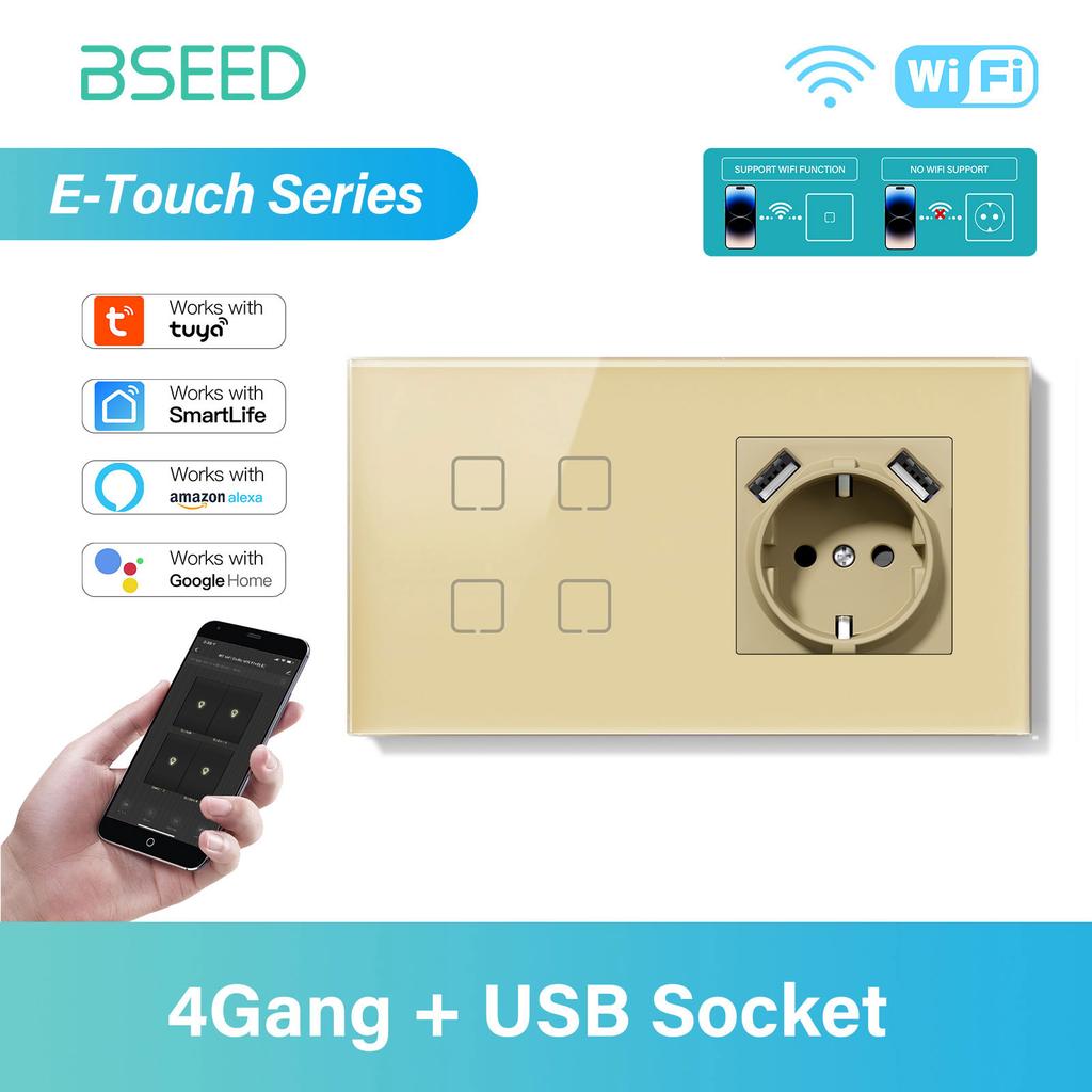 BSEED 1/2/3/4-клавишный сенсорный выключатель WIFI, стеклянный умный настенный выключатель света, сенсорный экран, подсветка, быстрая зарядка телефона, розетка USB C, серия E