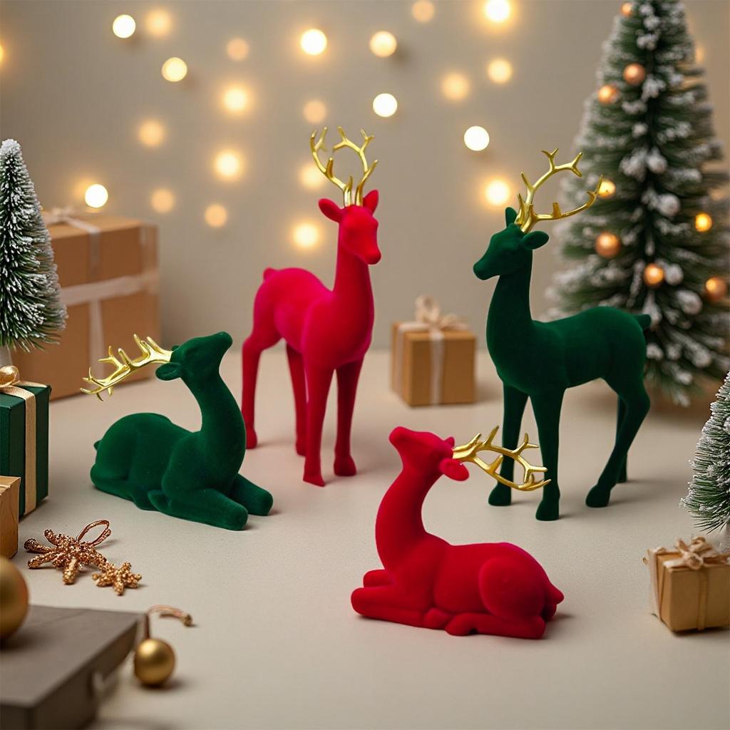 Reindeer Christmas Decor Flocking Deer Statue 2 Pieces Standing Sitting Sculpture Red Green Aesthetic Elk for Party Bedside