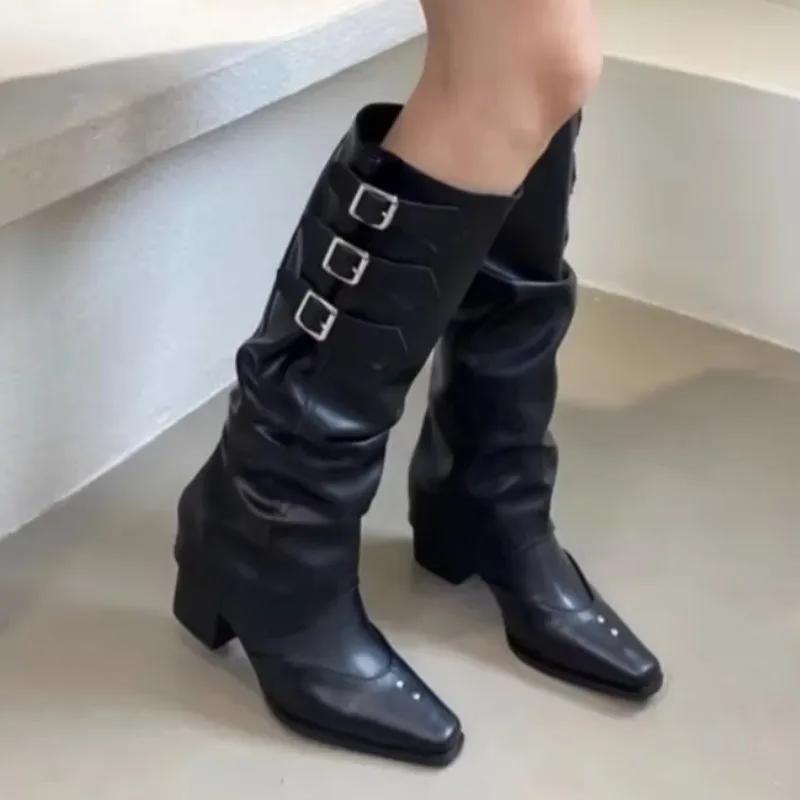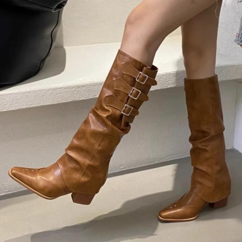 Женские ботинки 2024 года, модные новые плиссированные брендовые дизайнерские высокие ботинки весна-осень для отдыха на открытом воздухе с пряжкой на ремне, остроконечные мотоциклетные ботинки