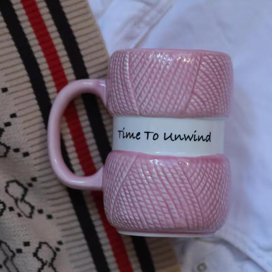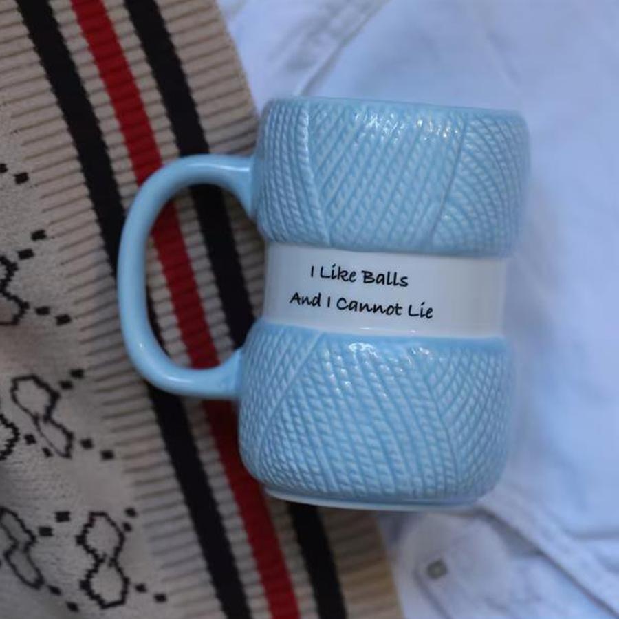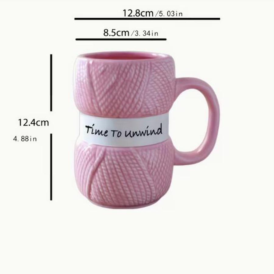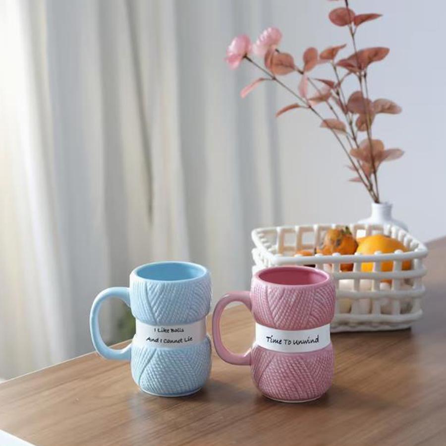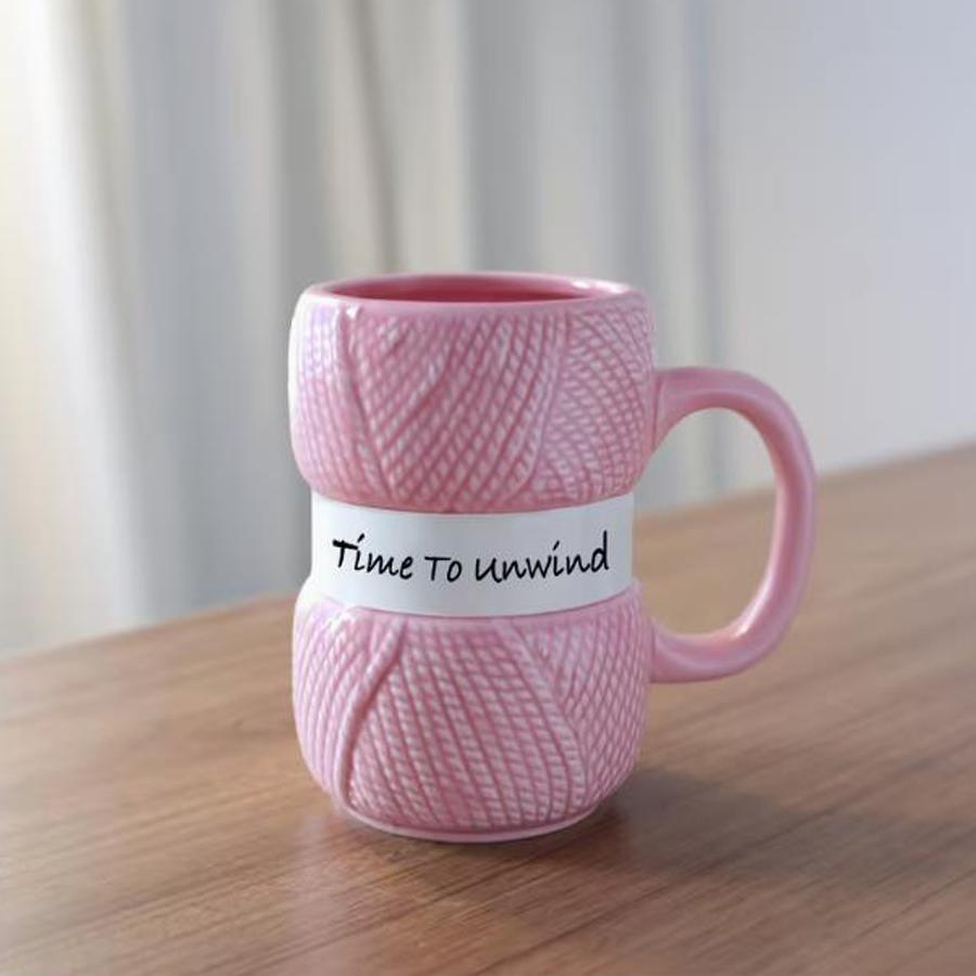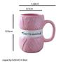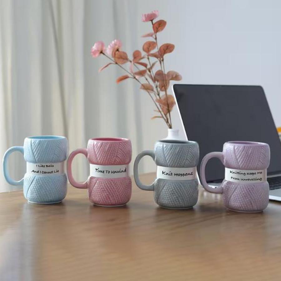 Керамическая кружка с вязаным узором в виде клубка пряжи и забавным слоганом.