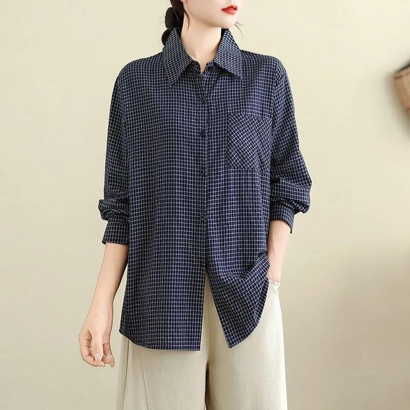 Весенне-осенняя рубашка ретро с клетчатым принтом, длинным рукавом, лацканами на пуговицах, повседневный свободный топ