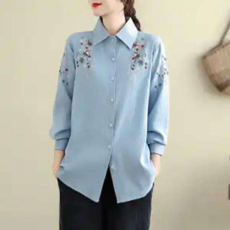 Весенне-осенняя литературная вышивка, универсальная джинсовая рубашка, свободная рубашка с длинным рукавом и воротником поло, женский топ