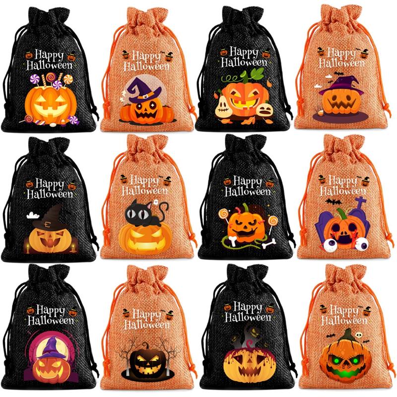 12pcs/sets Linen Halloween Gift Drawstrings Bag Black Orange Children's Candy Bag Pumpkin Burlap Bundle Drawstring Candy Bags
