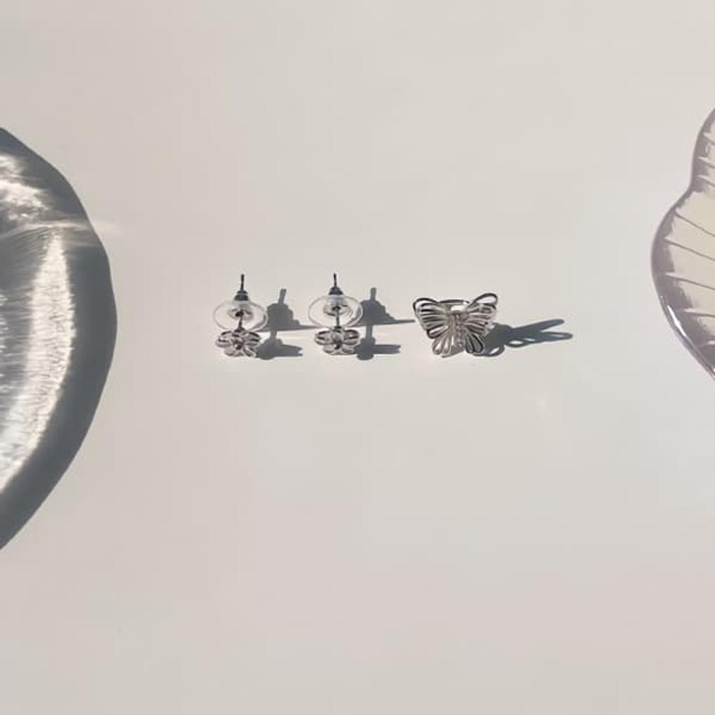 Women's Silver Butterfly Flower Earrings and Ear Cuff Set