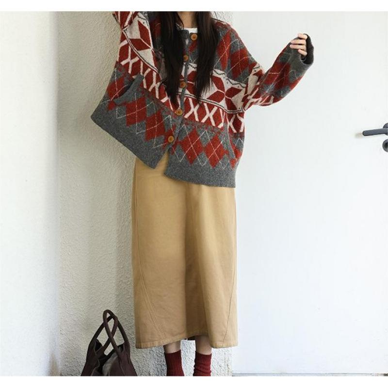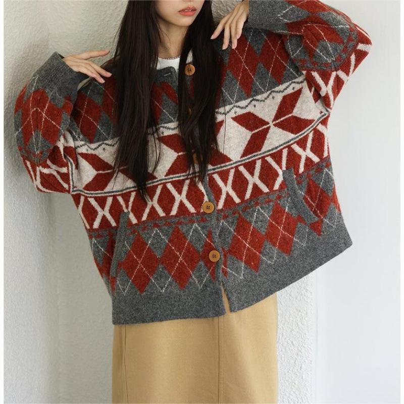 Жаккардовый свободный свитер-кардиган в скандинавском стиле с ромбовидной решеткой [Cherry Into Poetry] W5539 Удобный, универсальный и модный