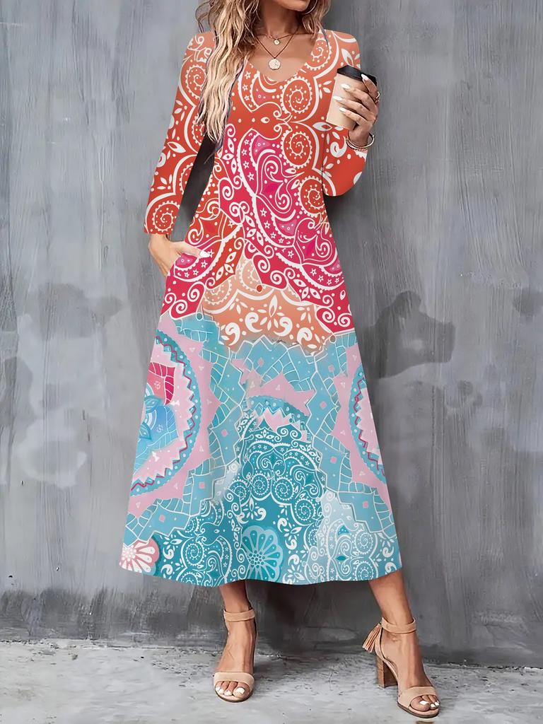 2025 Осень и Зима Новое Женское Повседневное Модное Платье 3D Геометрический Принт Длинный Рукав V-образный Вырез А-силуэт Платья