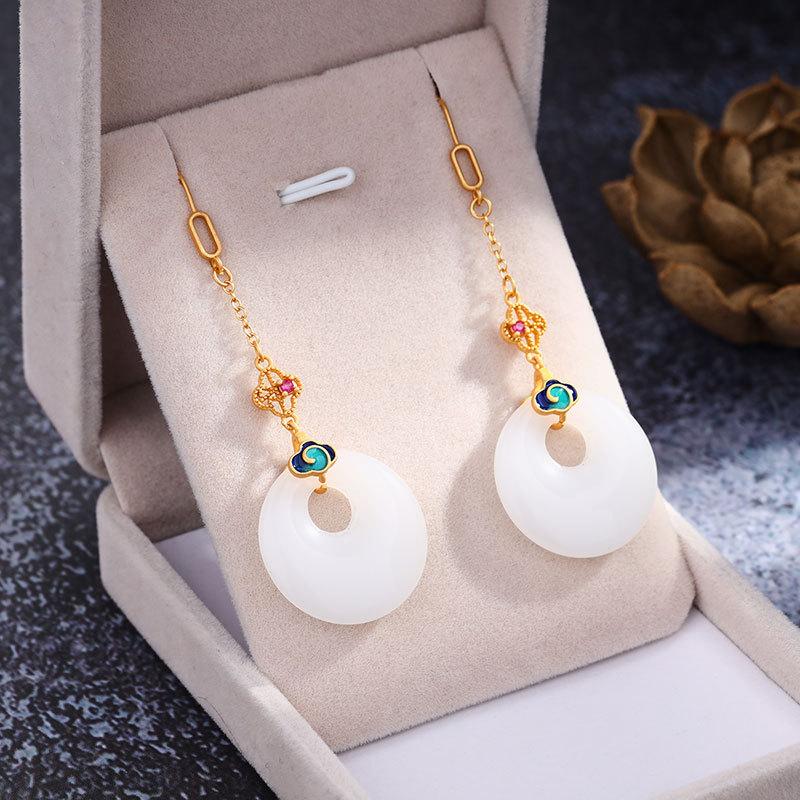 Новые Серьги-кисточки из натурального белого нефрита для женщин в придворном стиле, с эмалью в виде благоприятных облаков, изысканная цепочка