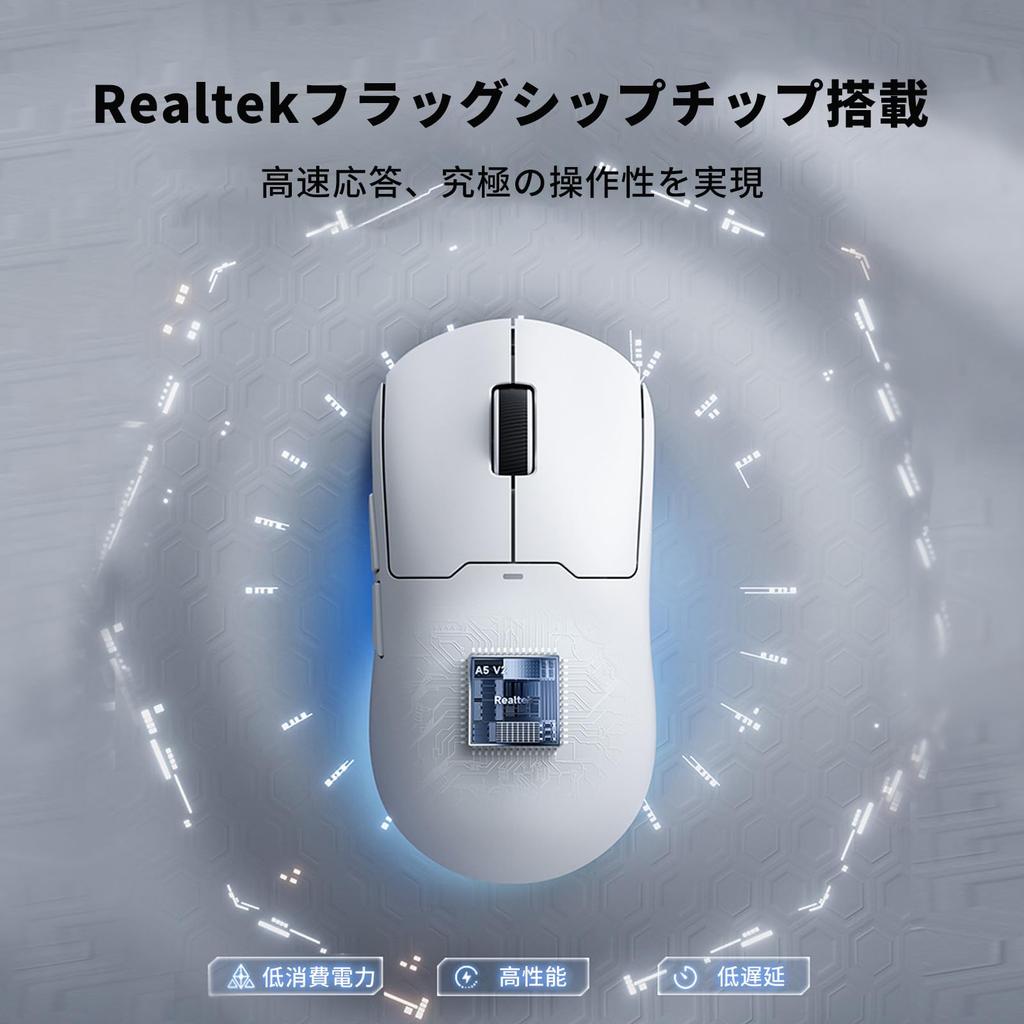[Gaming Mouse for Winning] The A5 V2 Ultra gaming mouse is equipped with Realtek's flagship chip and PixArt's high-performance PAW3395 sensor, which supports up to 26,000 DPI, 650 IPS, and 50G acceleration. It combines high-precision tracking with low-latency response for ultimate operability. The low-latency and low-power design provides a smoother, more stable experience. It also supports high polling rates of 8kHz wired and 4kHz wireless, delivering performance that even professional users will appreciate. [Lightweight at 54g, Ideal for Small and Medium Hands] The A5 V2 Ultra mouse is a lightweight, asymmetrical model weighing approximately 54g, ideal for small and medium-sized hands. The ergonomic design reduces wrist strain even with extended use, maintaining high dexterity and a comfortable grip during gaming. [High Durability and Comfortable Click] This mouse features Omron switches and a TTC GOLD wheel. With a durability of 60 million clicks, it provides a light and comfortable click feel. Additionally, 500