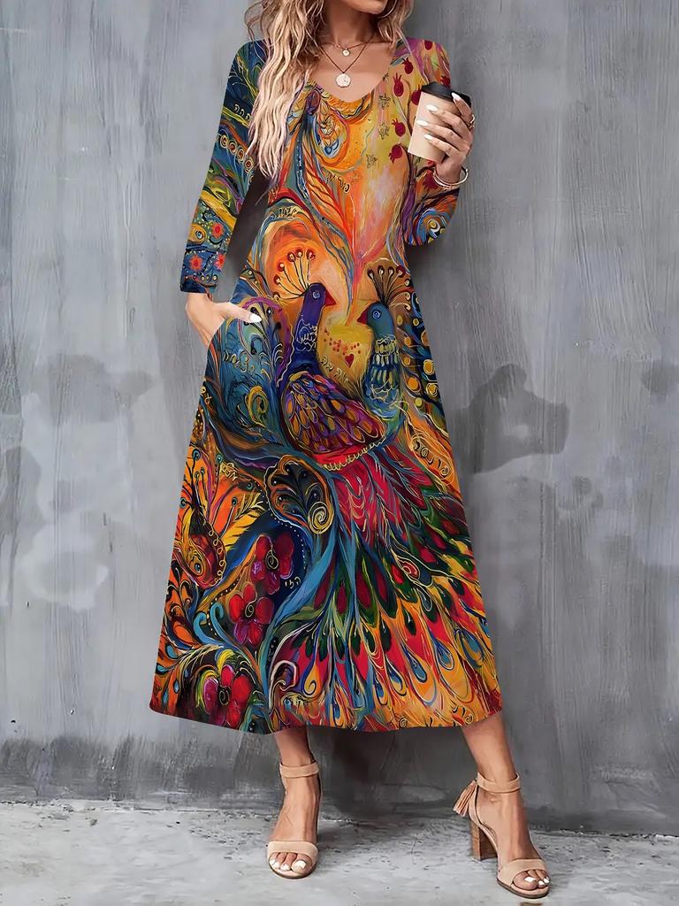 2025 Осень и Зима Новое Женское Повседневное Модное Платье 3D Ретро Принт с Узором Длинный Рукав V-образный Вырез А-силуэт Платья