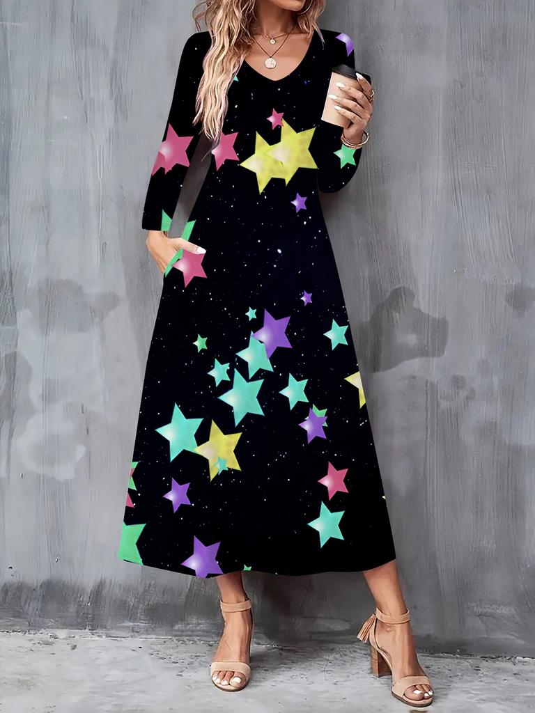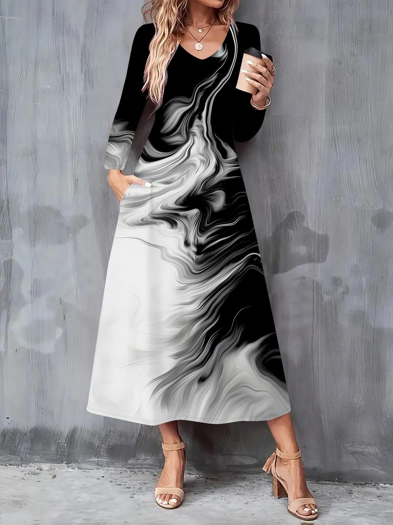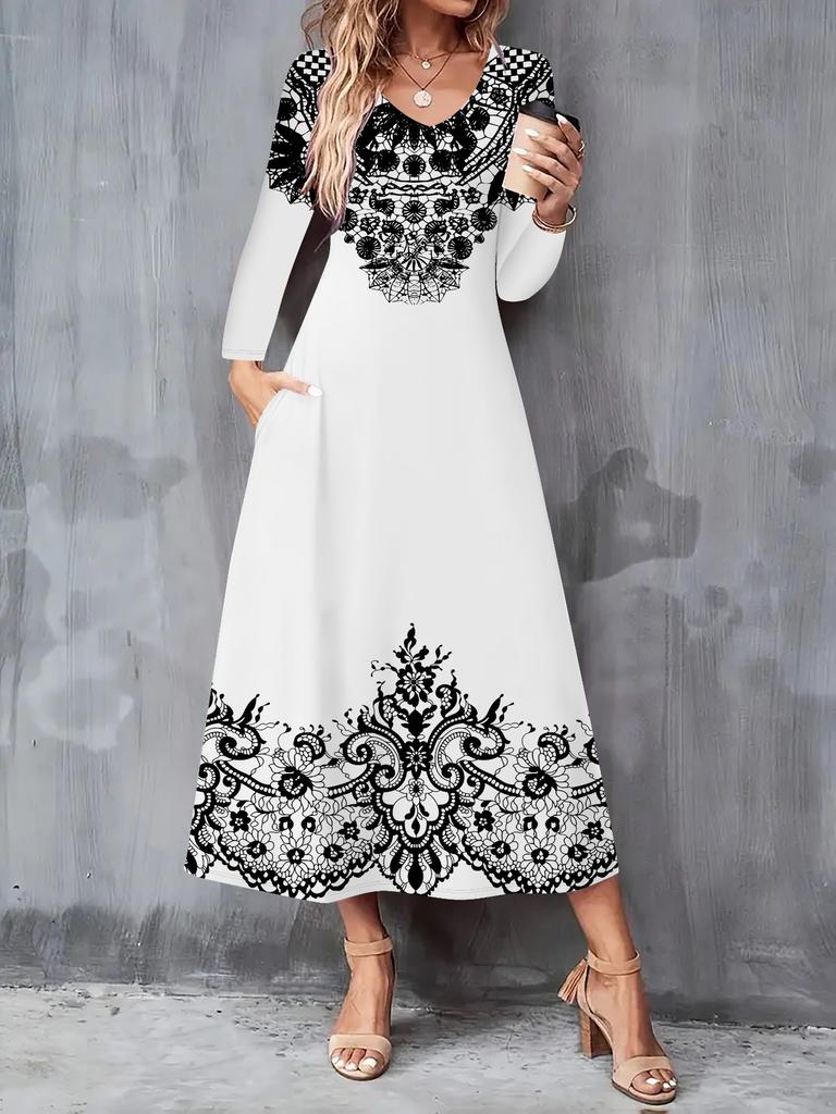 2025 Осень и Зима Новое Женское Повседневное Модное Платье 3D Ретро Принт с Узором Длинный Рукав V-образный Вырез А-силуэт Платья