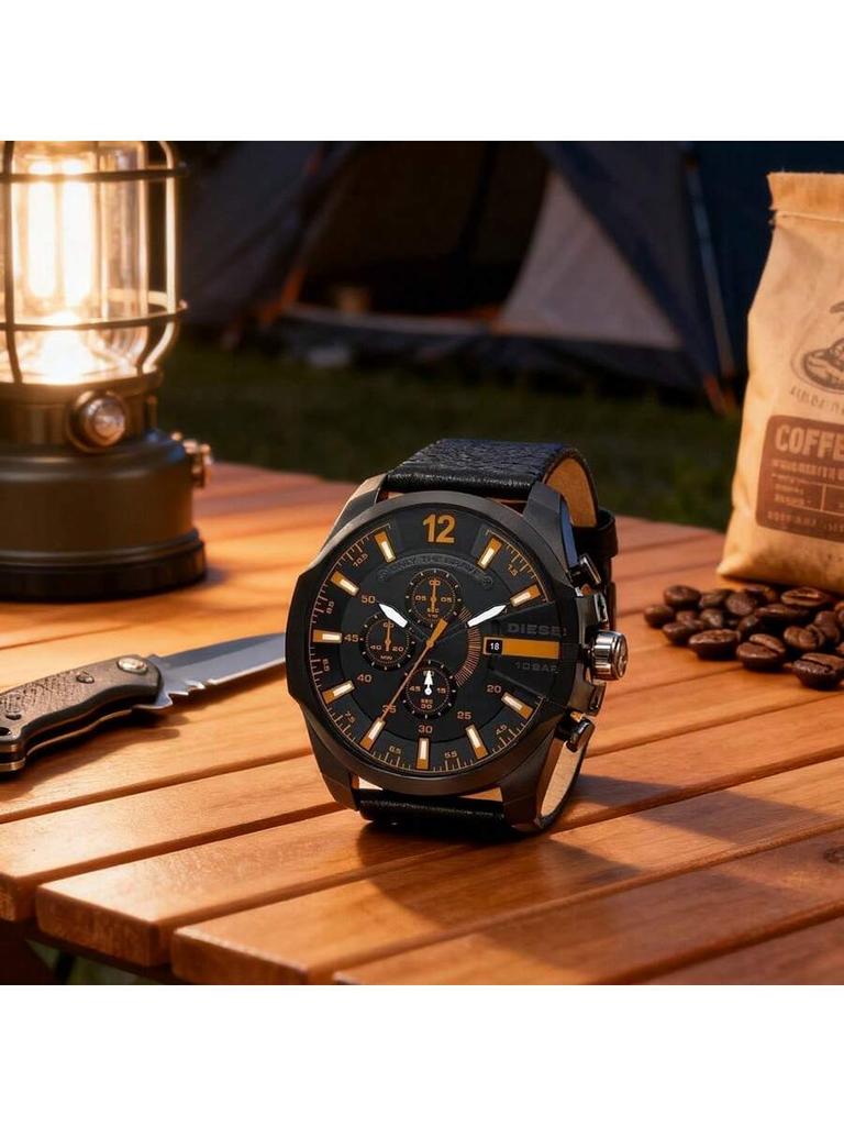 Meg Chief Классические Повседневные Мужские Кварцевые Часы DZ4291 51мм Черный Круглый Циферблат и Кожаный Ремешок