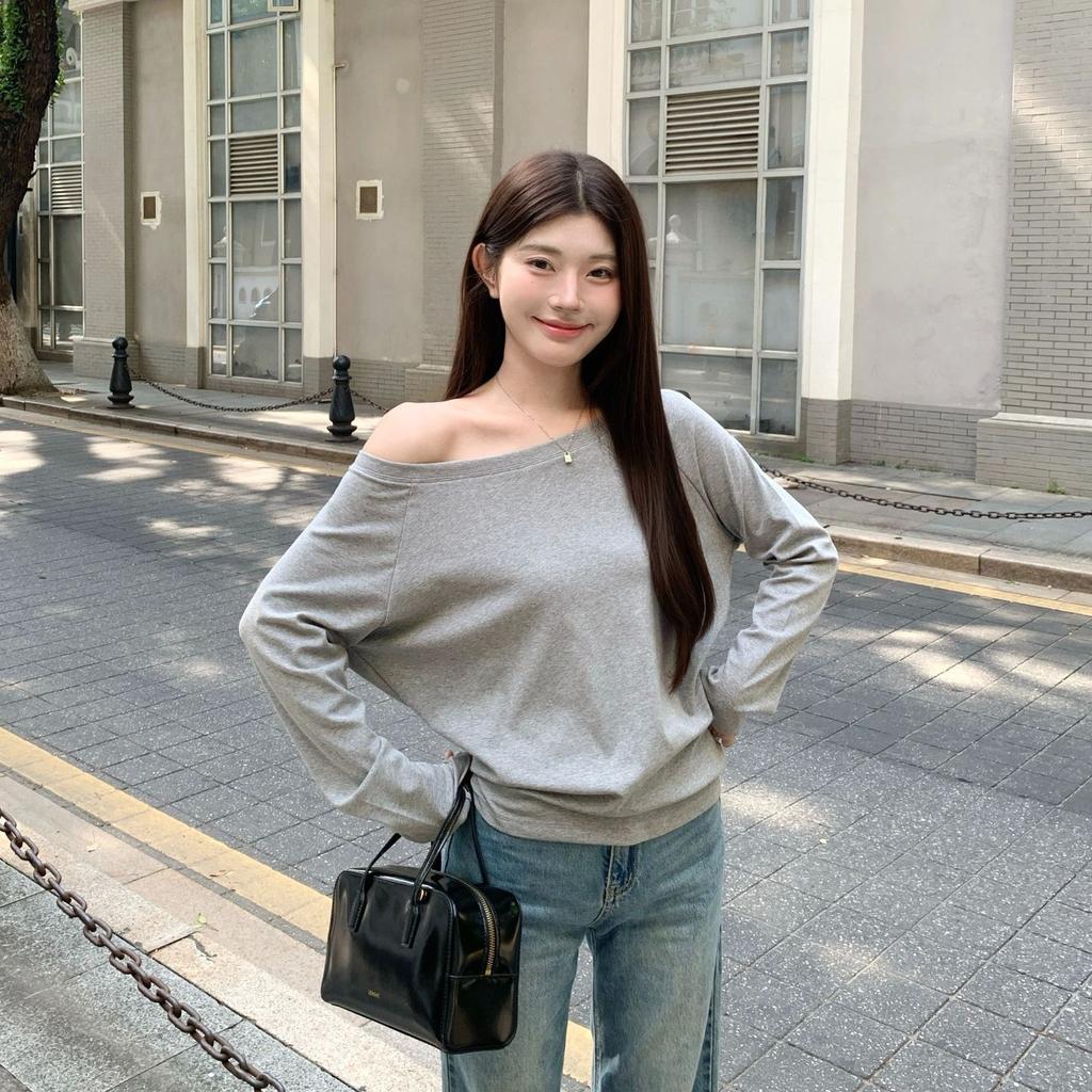 Весенне-осенняя свободная футболка с открытыми плечами и длинным рукавом Женская однотонная повседневная майка Женская базовая футболка Корейский стиль Молодежные блузки
