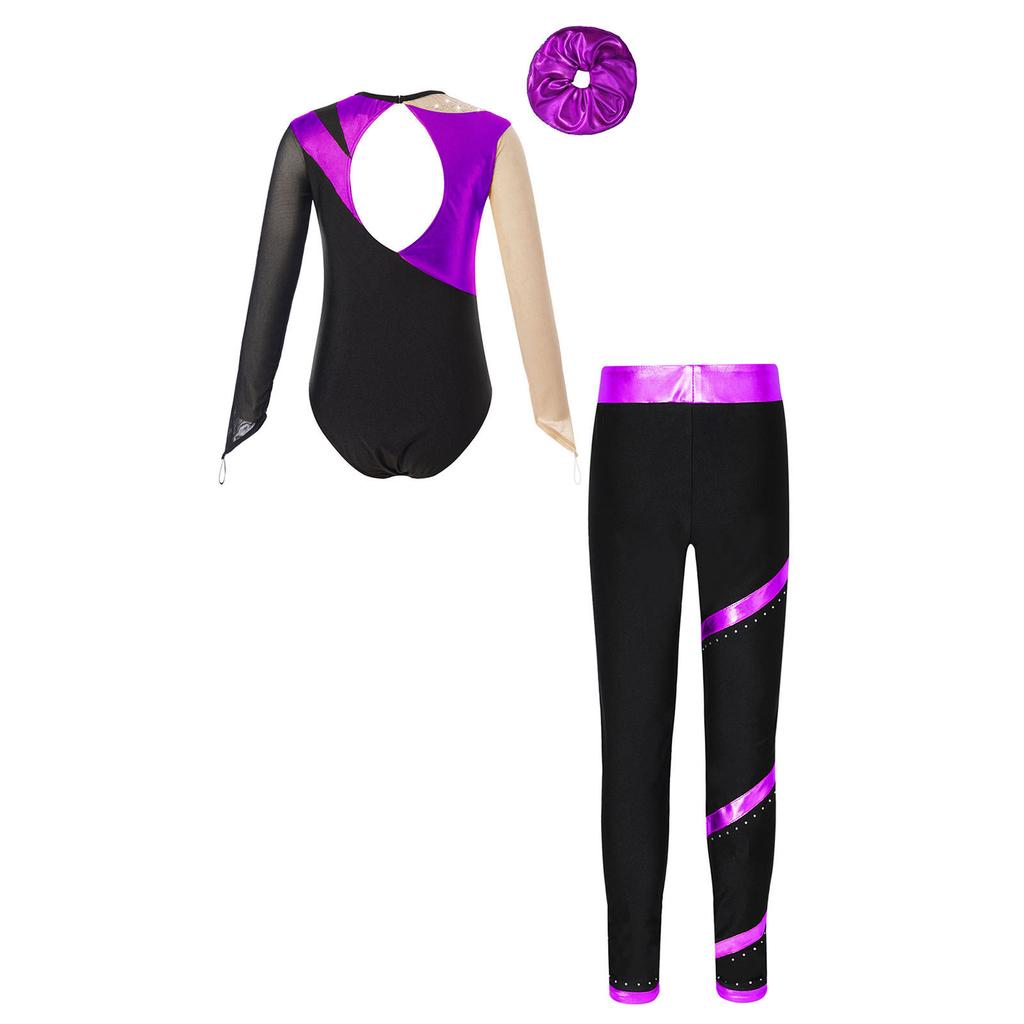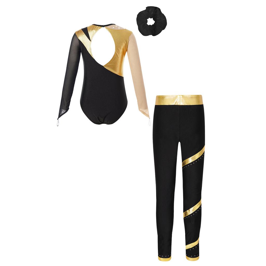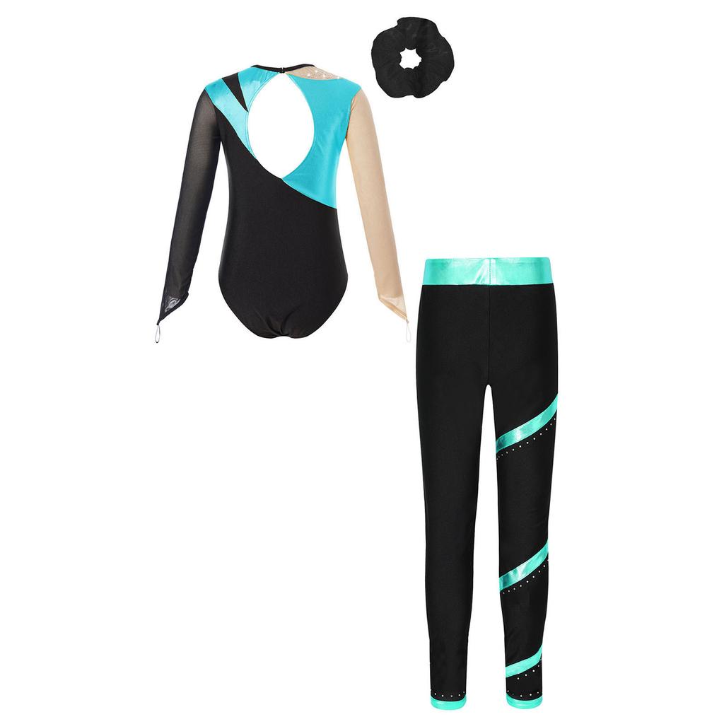 Комплект для танцев для девочек с блестящими стразами, боди с длинным рукавом и вырезом на спине, брюки с эластичным поясом и повязка для волос