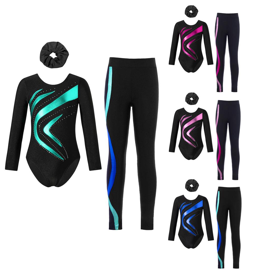 3 шт. Комплект для гимнастики и танцев для девочек, металлический лоскутный купальник со стразами, леггинсы, повязка на голову, длинный рукав