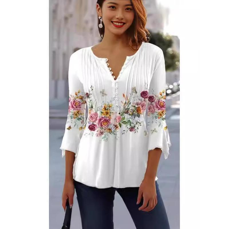 Весенне-летняя мода Новая женская футболка с цветочным принтом, V-образным вырезом, коротким рукавом, плиссировкой и пуговицами, базовая — купить товар онлайн с бесплатной доставкой по всему миру!