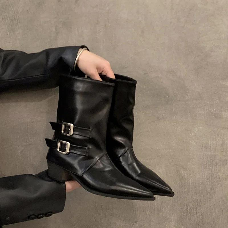 Осенне-зимние женские ботильоны, модные элегантные туфли с пряжкой на поясе и острым носком, на низком каблуке, узкие короткие ботильоны