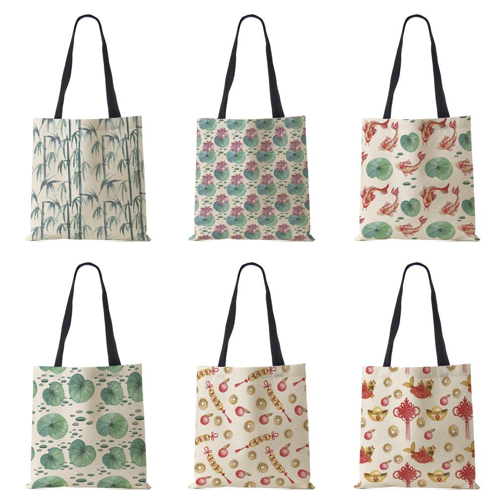 Сумки для покупок с принтом листьев лотоса и бамбука Женские складные многоразовые сумки-тоут через плечо Пейзажные холщовые повседневные сумки для продуктов 2022 KTB
