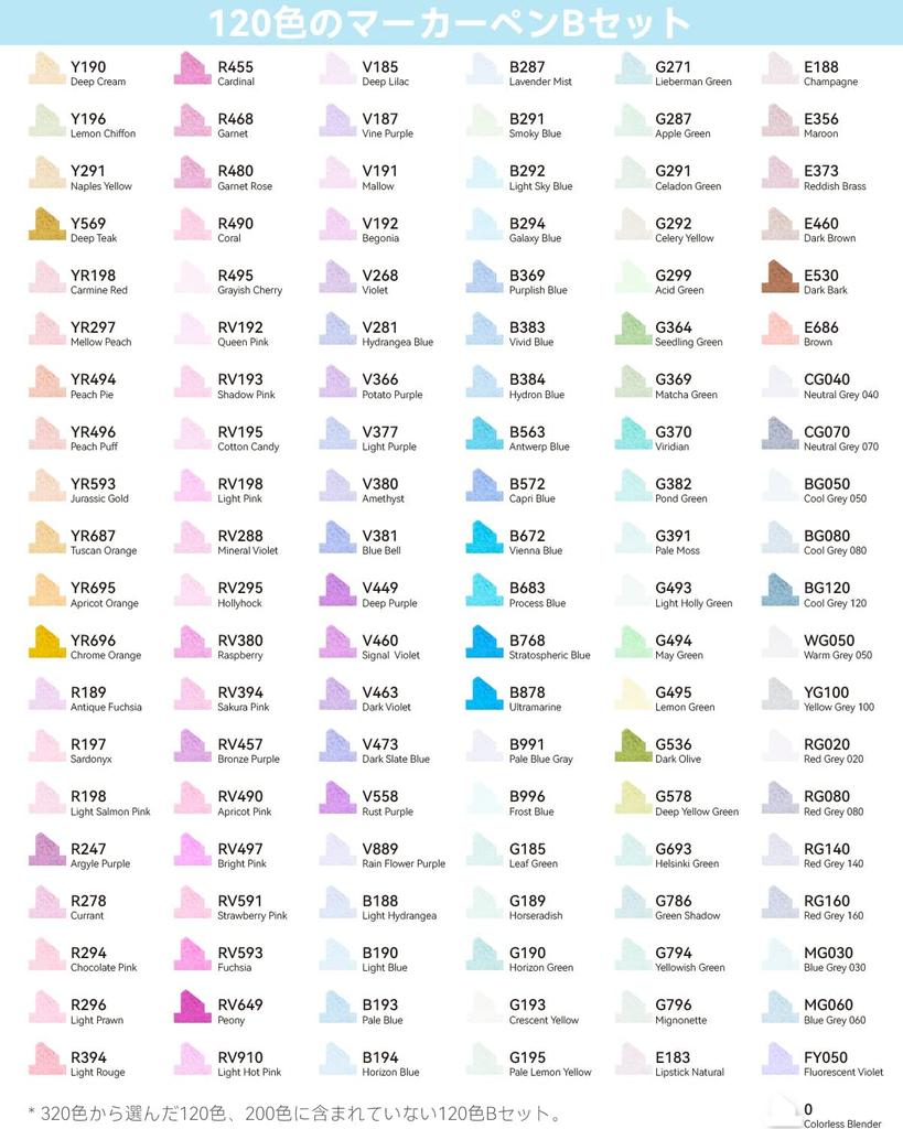 [120 Colors to Enthral You with Color Selection] In addition to the basic base colors of red, blue, yellow, green, and skin tones, this set includes a wide variety of cool, light, mid-tone, and dark tones. The wide range of colors makes it easy to create gradations of color from the same color family, from light to mid-tone to dark, when drawing illustrations of people. It also includes a blender pen, recommended for creating gradations and blurring. (This 120-Color Set B adds 120 new colors out of the 320 available. So, if you purchase both the 200-Color and 120-Color Set B, you'll have all 320 colors.)