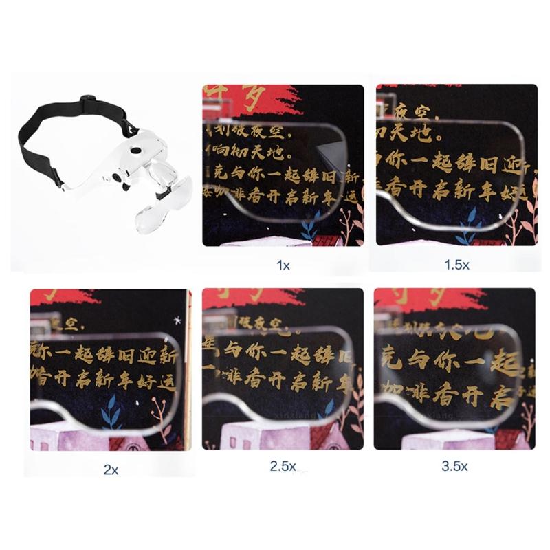 Переключение между 5 оптическими линзами с помощью простой системы щелчка и отпускания. Увеличение налобной лупы: 1,0X, 1,5X, 2,0X, 2,5X, 3,5X. Устойчивый к царапинам акрил снижает вес.
