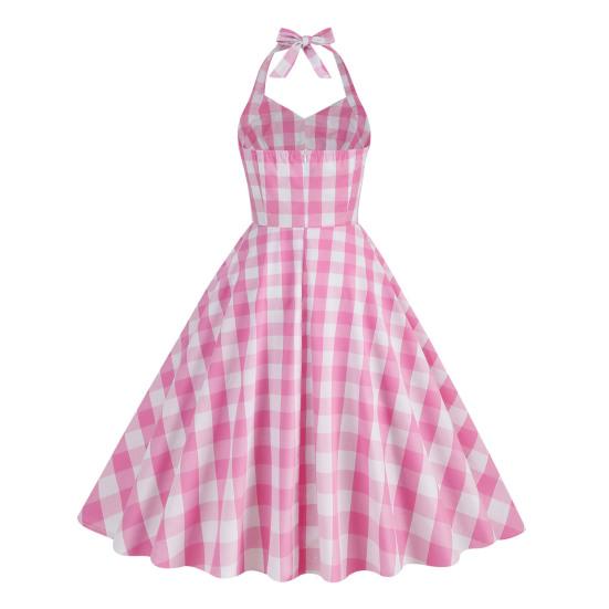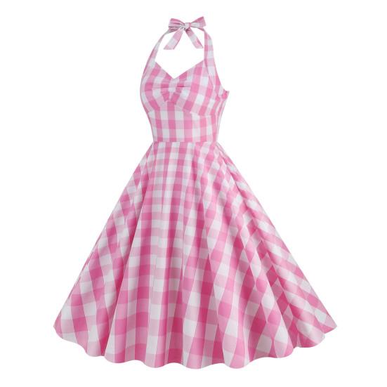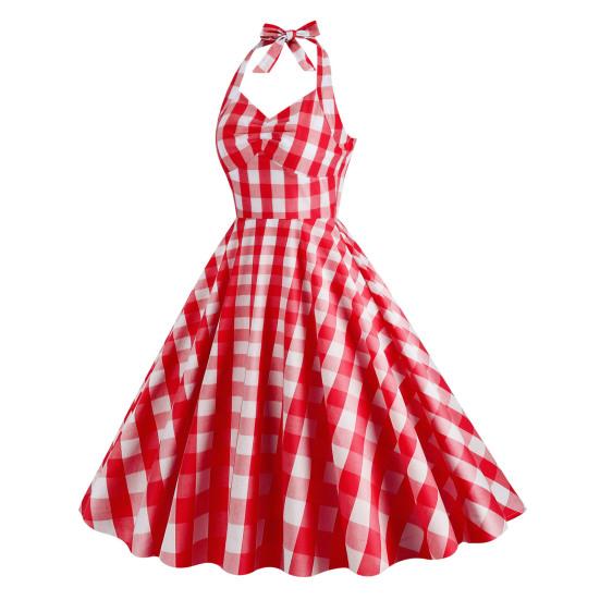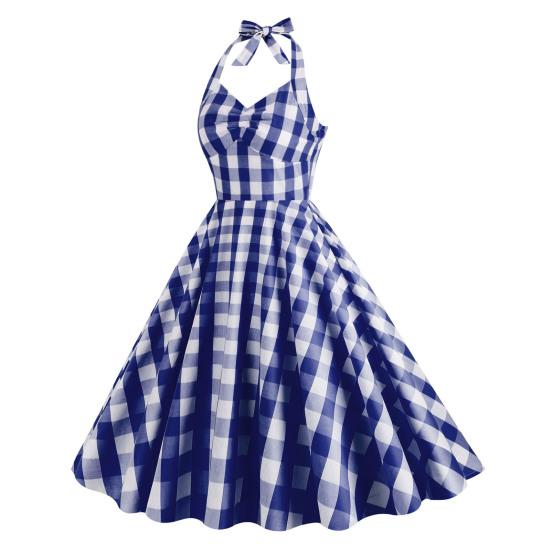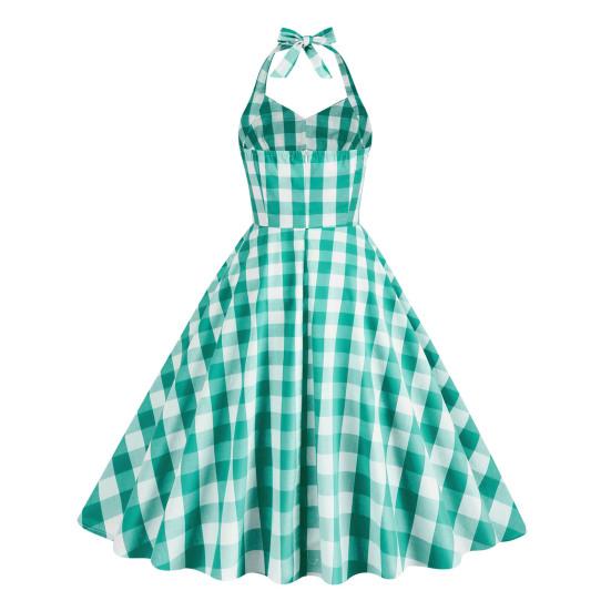 Elegant Vintage Plaid Dress: High-waisted corset dress with a tie halterneck and swing hem, perfect for a timeless look.
