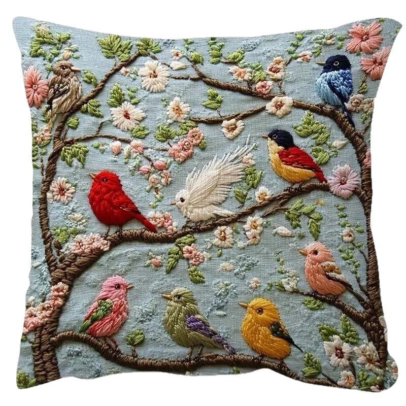 Вышитая наволочка 45 см с красочными птицами и цветочным принтом для декора гостиной