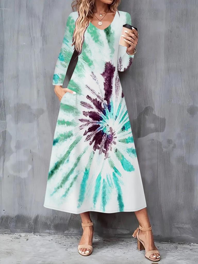 Осень-Зима 2025 Новое Женское Повседневное Модное Платье 3D Принт Тай-дай Длинный Рукав V-образный Вырез A-силуэт