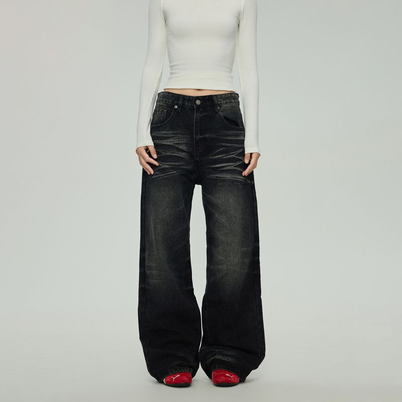 Black of Exit American Street Style Raw Denim Jeans Spring and Autumn Casual Straight-Leg Denim Pants for Men and Women