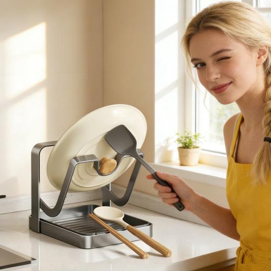 Keep Counters Clean and Dry: Featuring an integrated base tray, this lid holder effectively catches condensation, sauce drips, and water runoff from lids and utensils. It prevents messy pools on stovetops or countertops, maintaining a tidy cooking environment and simplifying cleanup after use.