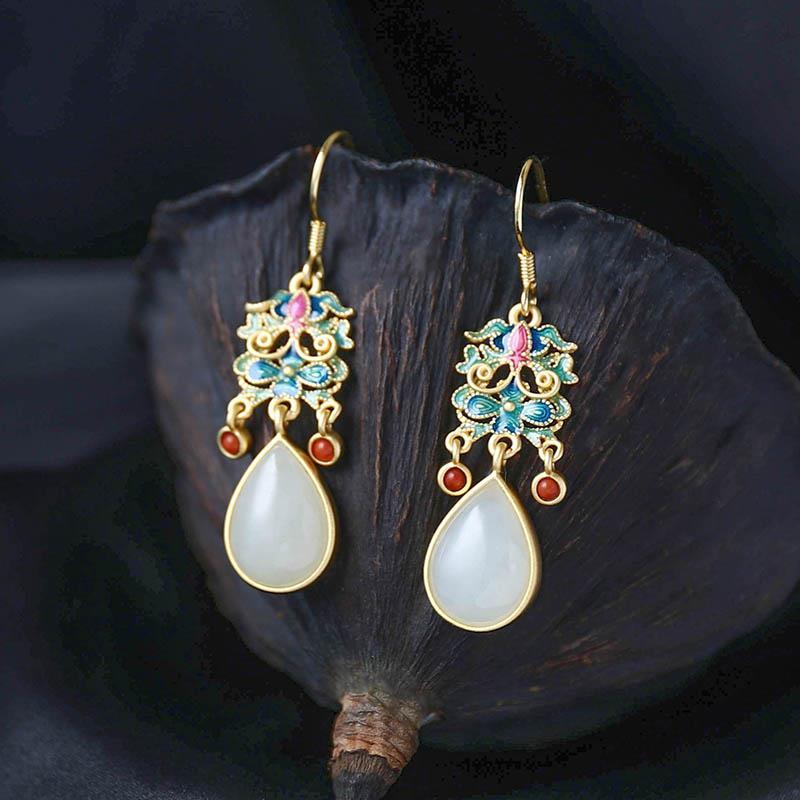Natural Hetian White Jade Colorful Enamel Porcelain Drop-Shaped Earrings Chinese Retro Light Luxury Charm Women'S Jewelry