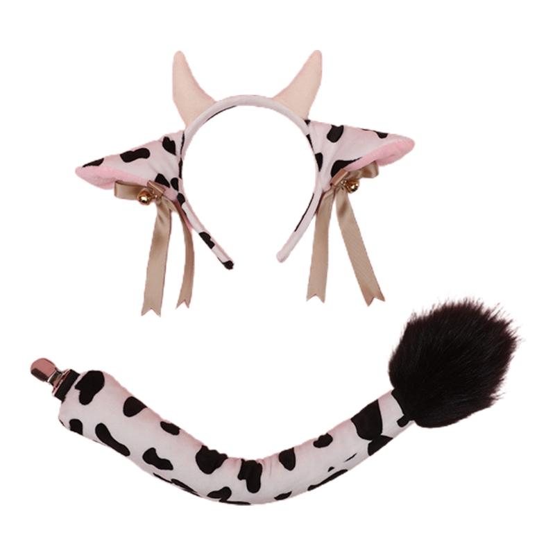 Faux Fur Animal Headbands Furry Cow Ears Headwear Tail Set Kawaii Hair Hoop for Halloween Cosplay Party Supplies