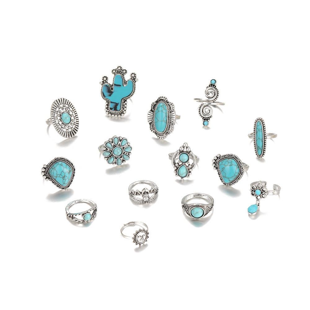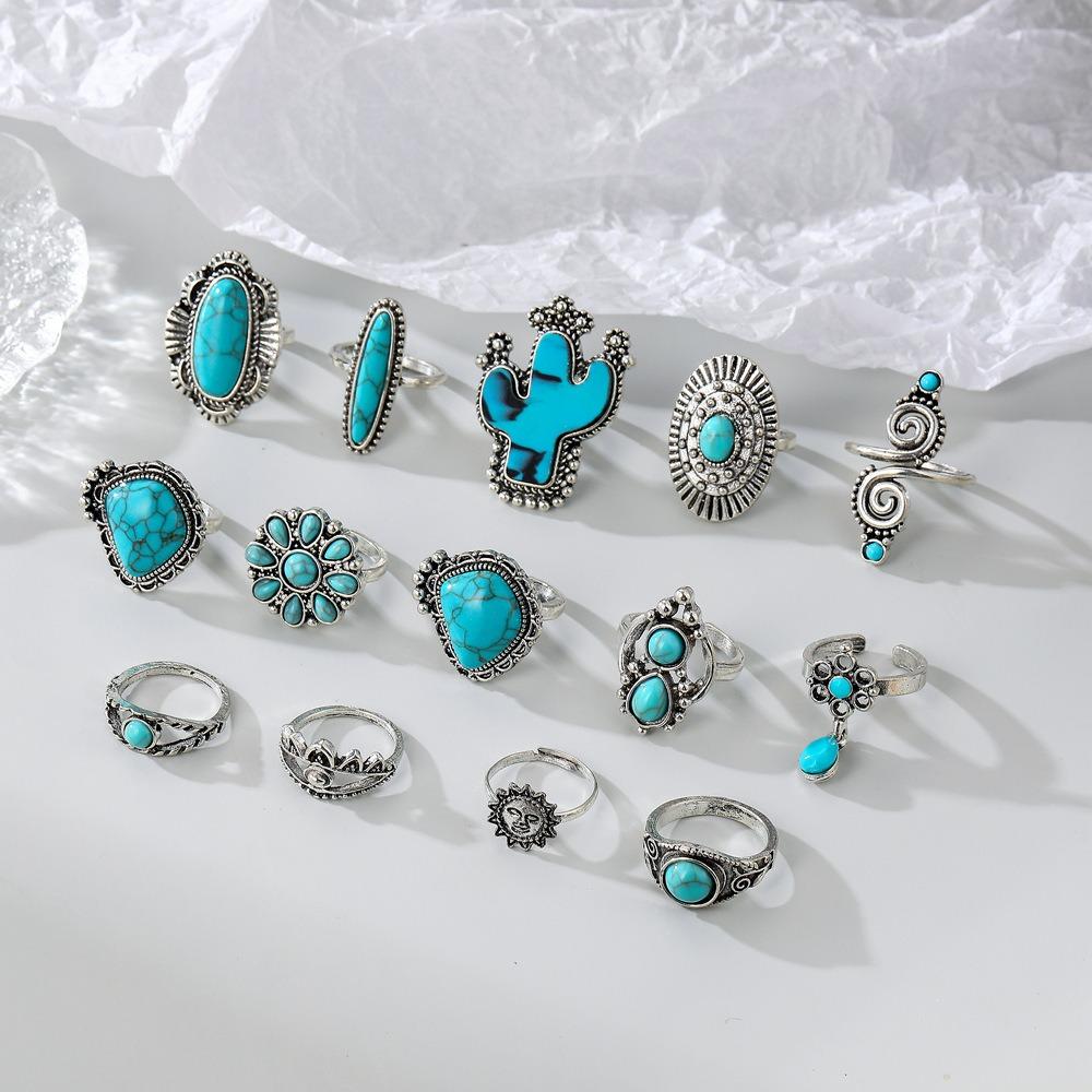 14 шт./набор Резные бирюзовые кольца Кактус Открытое кольцо Кольцо в винтажном богемном стиле Девушка