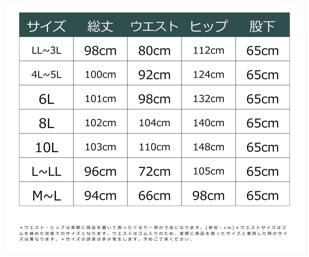 [4L~5L]: Total length: 98cm, Waist: 92cm, Hips: 124cm, Inseam: 65cm