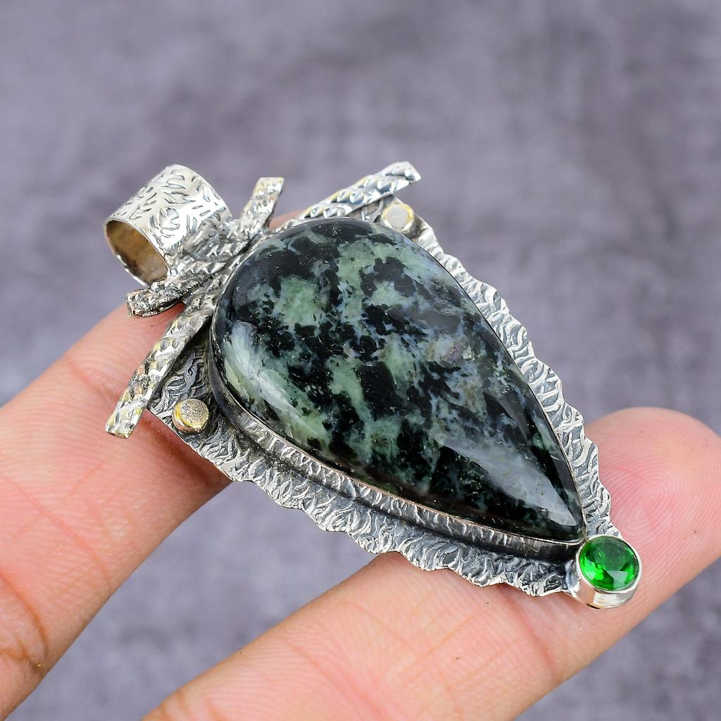 Natural Serphanite, Diopside Handmade 925 Sterling Silver Pendant 2.37" ET-1454