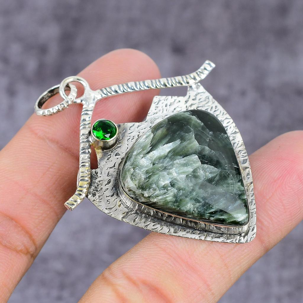 Natural Seraphinite, Diopside Gemstone 925 Sterling Silver Pendant 2.28" ET-1559