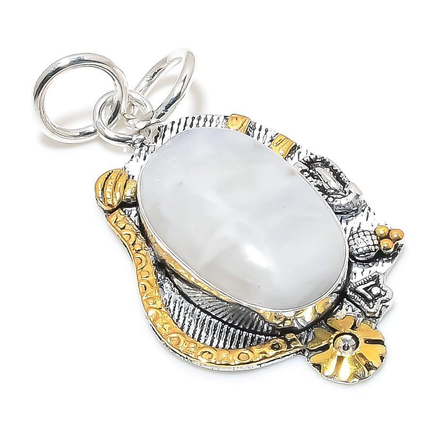 Natural Rainbow Moonstone Stone 925 Sterling Silver Two Tone Pendant 2.09" STT-2013